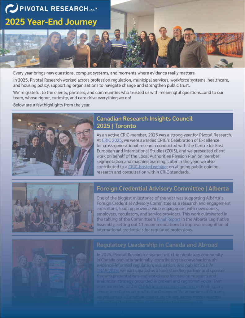 Newsletter December 2025 From recognition through CRIC’s Celebration of Excellence, to policy impact with Alberta’s Foreign Credential Advisory Committee, to Voice of the Patient research that our clients are choosing to make public—demonstrating regulatory excellence, and taking Canadian case studies far and wide, this year reinforced the value of evidence-informed decision-making. We’re grateful to the […]